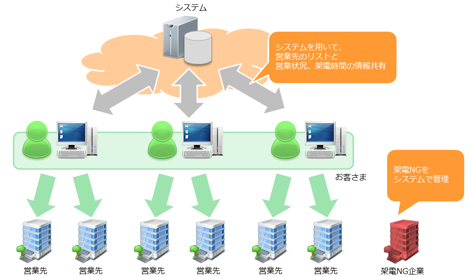 共有が必要な情報をシステムで一元管理するようにしました。 電話での営業が多いとのことでしたので、担当者が営業を行いながらその状況を更新でき、他担当者の状況も確認できるようリアルタイムで情報を共有できるシステムを現在の業務に合わせたカタチでご提案しました。 また、営業状況や成果を分析できるようにするための目標設定や営業状況の確度の統一化、手作業で作成する申込書の自動化など、システムでできる業務効率化をご提案し、現在もお取引を続けていただいております。