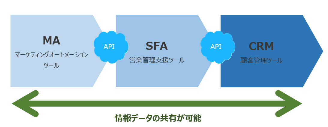 SFAとセットで導入されるシステムとして顧客管理(Customer Relationship Management/略してMA)やマーケティング活動を自動化、効率化するMA(Marketing Automation)などがあります。