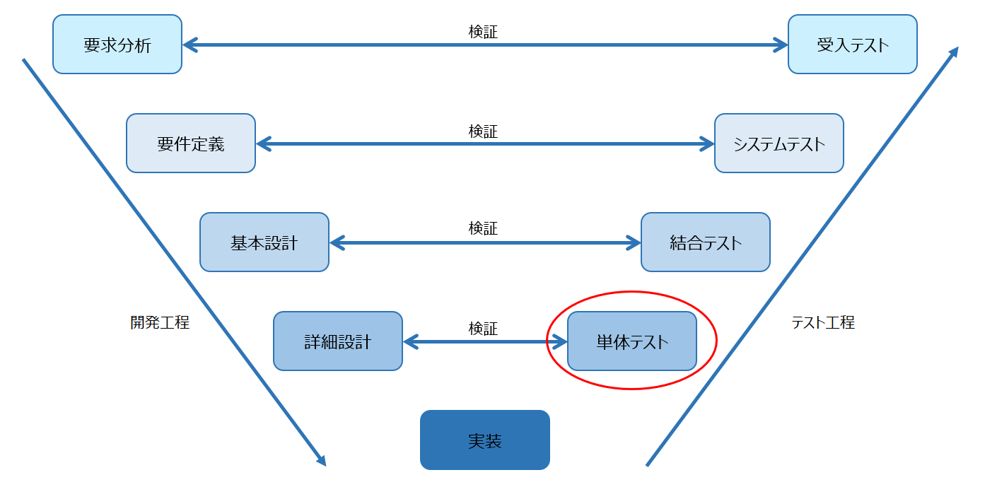 単体テストは、システム開発全体の中では実装の次のフェーズになり、テスト工程としては最初のフェーズで、詳細設計と対となる位置にいます。