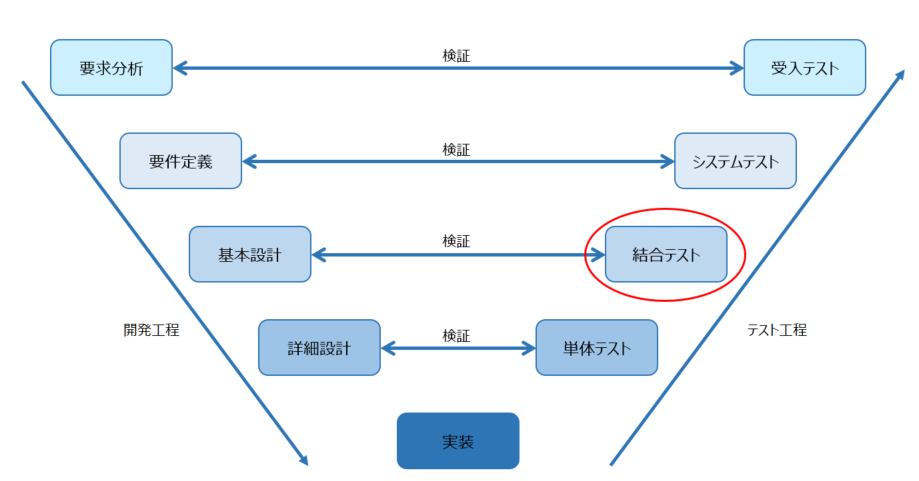 結合テストは、システム開発全体の中では単体テストの次のフェーズになり、テスト工程としては中盤のフェーズで、基本設計と対となる位置にいます。
