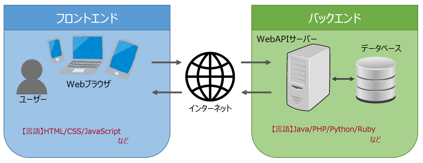 私たちが日頃使用しているWebシステムやWebアプリケーションは、以下の図のように「フロントエンド」、「バックエンド」という2つの仕組みによって動作しています。